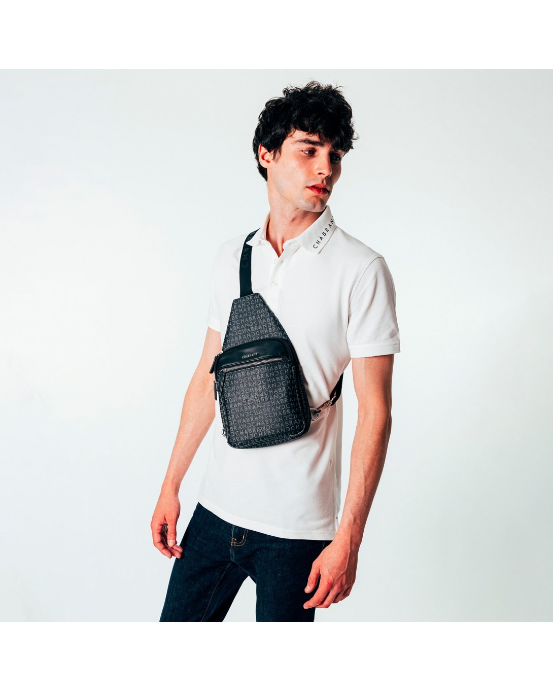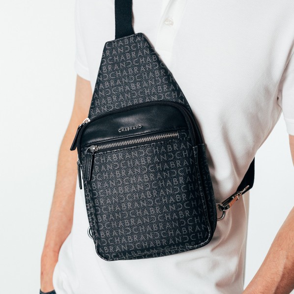 Body-bag noir en toile enduite siglée garnie cuir
