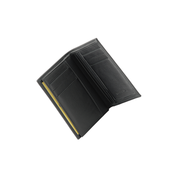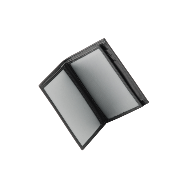 - Un portefeuille à la française : 10 x 12,5 x 2 cm composé de trois volets, six emplacements carte, une poche plaquée zippée, quatre emplacements multifonctions, et deux parois plastifiées.